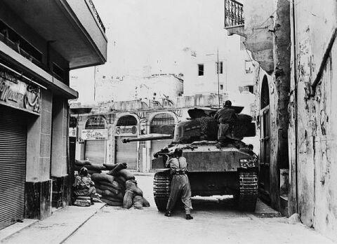 This picture is linked from the Cedarland website. It is captioned "Fierce fighting in ancient Tripoli. Insurgents staged a mass street charge, fighting house to house against government forces for sixty hours. This is one of the only photos known to have been taken during the battle. Soldiers of the Lebanese army are firing from a behind a tank and sandbag barricade from cover of a narrow street. May 22, 1958". | ||