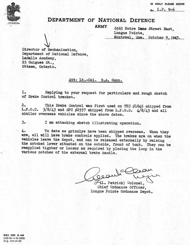 It mentions that the brake control bracket "was first used on TKC(1) #1645 shipped from the L.P.O.D.(2) 3/8/43 and SPC(3) [sic] #2557 shipped from L.P.O.D. 4/8/43 and all similar overseas vehicles since the above dates." (1) Tank,