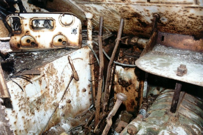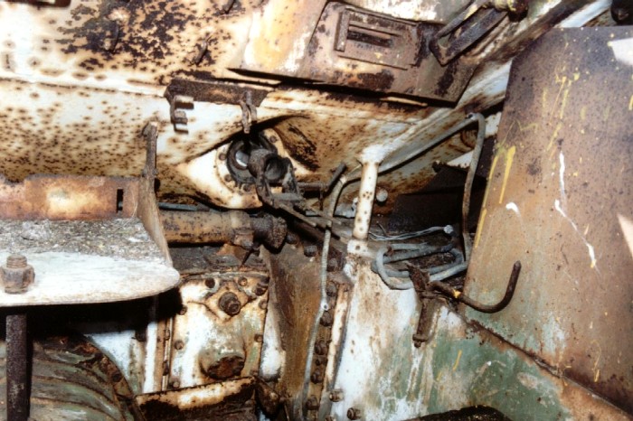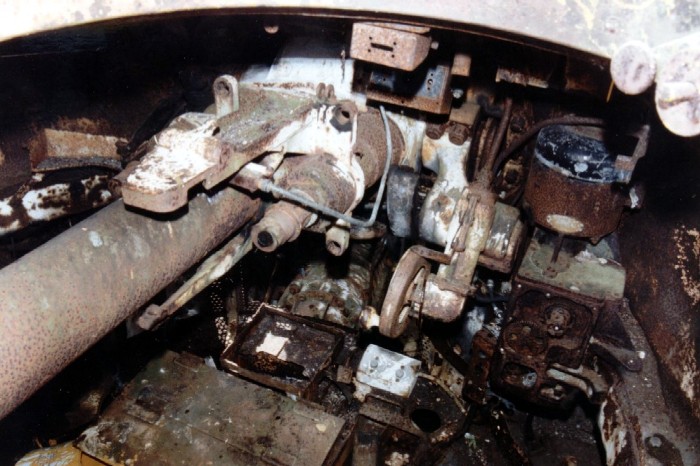 ![]() The rear of the instrument panel is still there, though the front is long gone. Also visible are the steering levers, the end of the gear stick and the choke lever on the lower hull side. The choke is peculiar to the M4A4. |