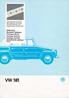 As for all models, Volkswagen AG in Germany published a Genuine Parts Illustrated Catalogue for the VW 181. This is not a real parts list: it only contains sketches for positive identification when ordering parts. Latest know edition is the 1990 one, order no. 000.7340.86.89, which should be available through your VW dealer. |